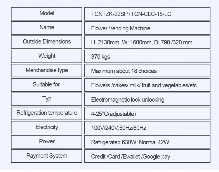 Αυτοί οι αυτόματοι πωλητές λουλουδιών προσφέρουν έναν πλήρως αυτοματοποιημένο τρόπο διάθεσης φρέσκων ανθοδεσμών όλο το 24ωρο. Με ελεγχόμενη ψύξη, ασφαλή διαχείριση προϊόντων και υποστήριξη σύγχρονων μεθόδων πληρωμής, εξασφαλίζουν ότι οι πελάτες μπορούν να αγοράζουν άριστα διατηρημένα λουλούδια οποιαδήποτε στιγμή, καθιστώντας τους ιδανικούς για εμπορικά κέντρα, νοσοκομεία, ξενοδοχεία και πολυσύχναστους δημόσιους χώρους.