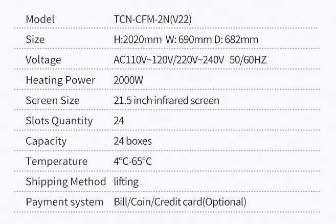 Αυτοί οι αυτόματοι πωλητές φρέσκων τροφίμων έχουν σχεδιαστεί για ασφαλή αποθήκευση και διάθεση γευμάτων, χρησιμοποιώντας προηγμένη ψύξη και ακριβή έλεγχο θερμοκρασίας. Ιδανικοί για χώρους εργασίας, σχολεία, νοσοκομεία και περιοχές με υψηλή επισκεψιμότητα, προσφέρουν έναν πρακτικό τρόπο παροχής έτοιμων προς κατανάλωση γευμάτων με αξιόπιστη λειτουργία και υποστήριξη σύγχρονων συστημάτων πληρωμής.
